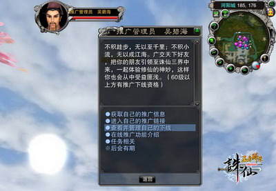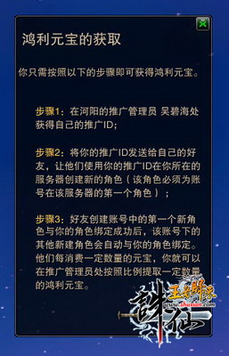 在游戏内,所有60级以上的修真者都可以在河阳城NPC“推广管理员-吴碧海”处获得邀请ID,通过邀请朋友进入《诛仙》世界而获得【推广积分】和【推广鸿利】,换取珍贵奖励!