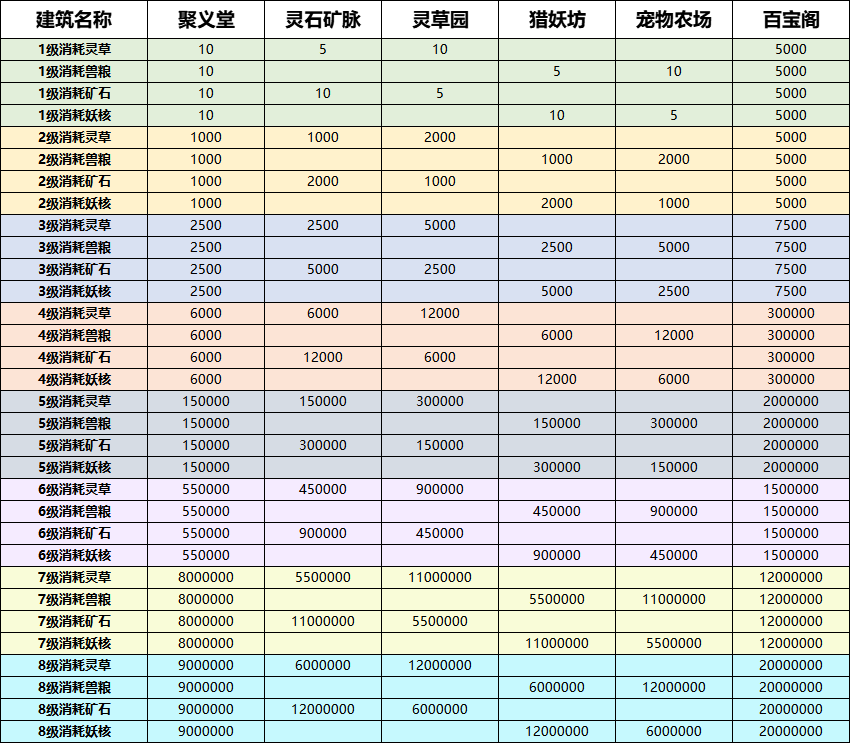 2、提升帮派建筑等级上限。更新后帮派基地内“聚义堂”、“灵草园”、“宠物农场”、“猎妖坊”、“灵石矿脉”及“百宝阁”建筑的等级上限由原3级提升至8级并修改建造规则。