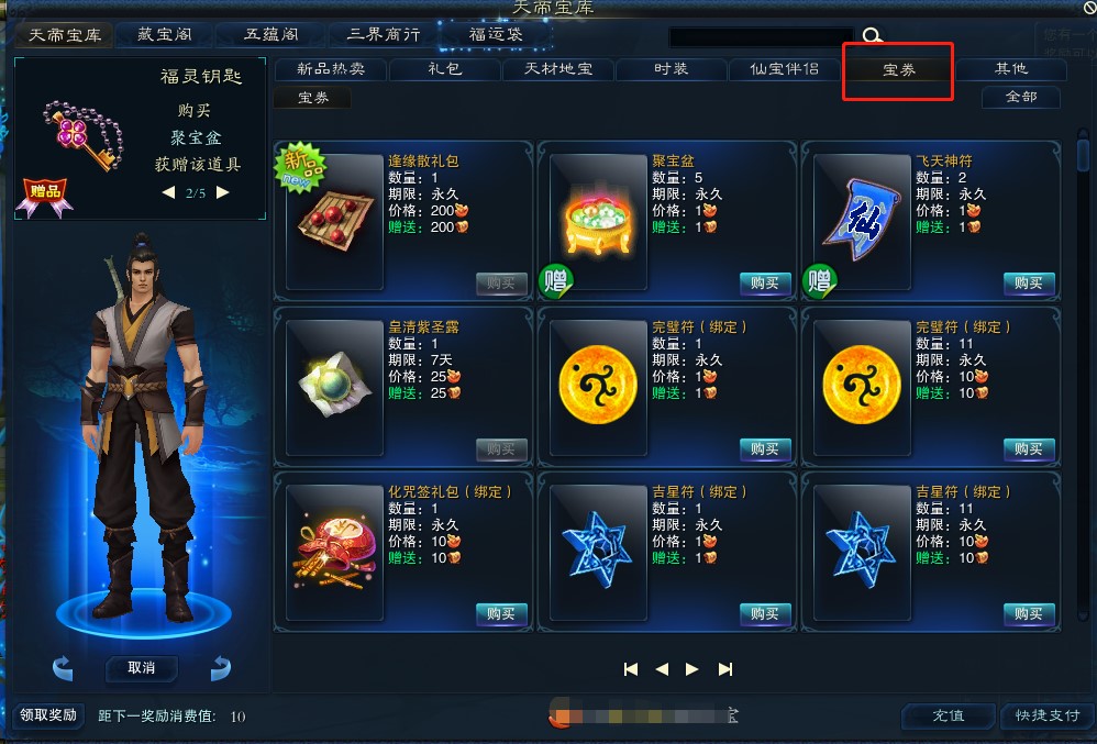 点击游戏右下角天帝宝库按钮或按ALT+J键呼出天帝宝库,点击充值按钮完成10元宝充值后可以获得奖励。