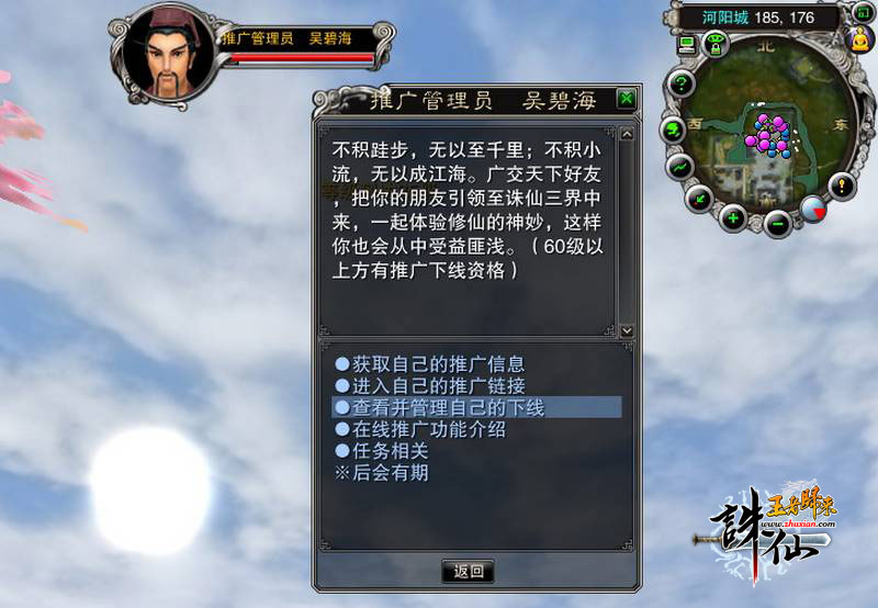 在游戏内,所有60级以上的修真者都可以在河阳城NPC“推广管理员-吴碧海”处获得邀请ID,通过邀请朋友进入《诛仙》世界而获得【推广积分】和【推广鸿利】,换取珍贵奖励!